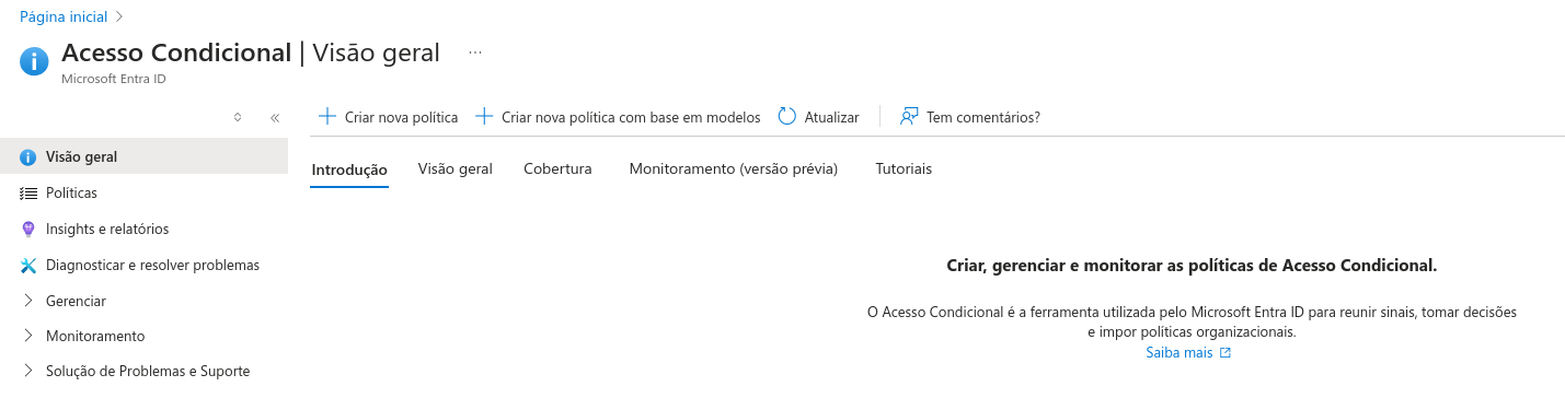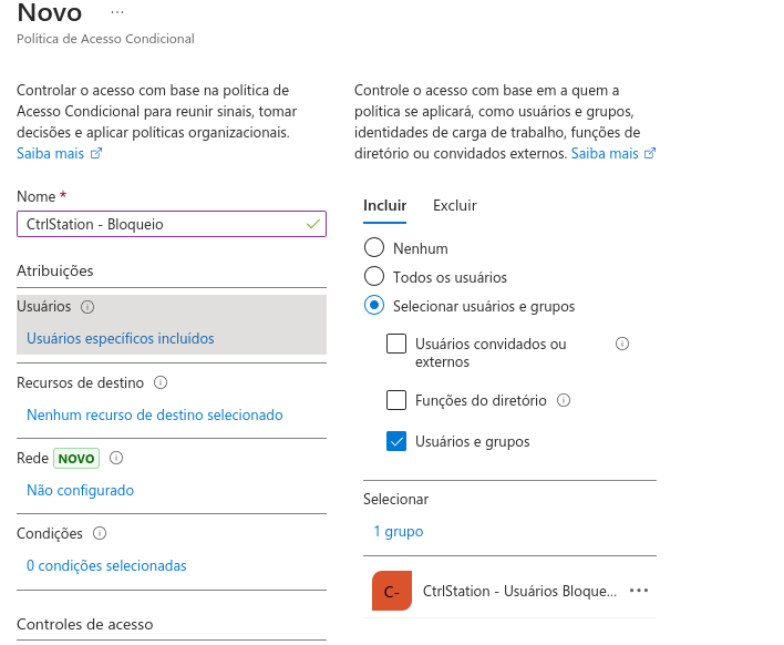 Com o grupo criado, podemos seguir coma configuração da política do Entra ID. Para isto: