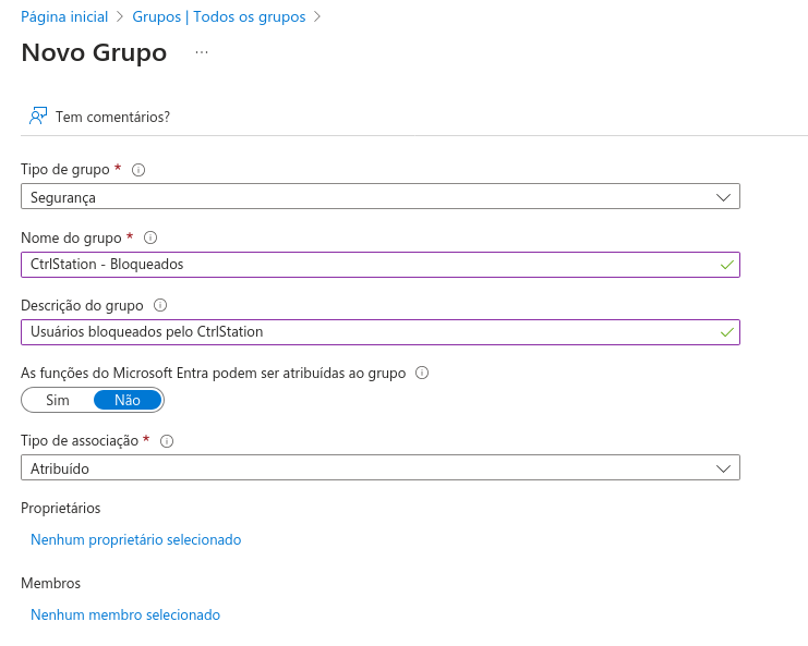 Primeiro é necessário criar um grupo no Azure AD. Este grupo será controlado inteiramente pelo CtrlStation não devem ser adicionados usuários manualmente. Para criar o grupo: