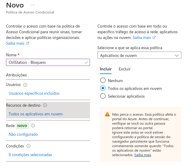 - No item "Recursos de destino" selecionar "Todos os aplicativos em nuvem":